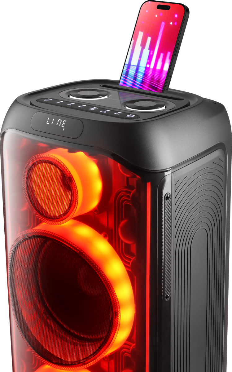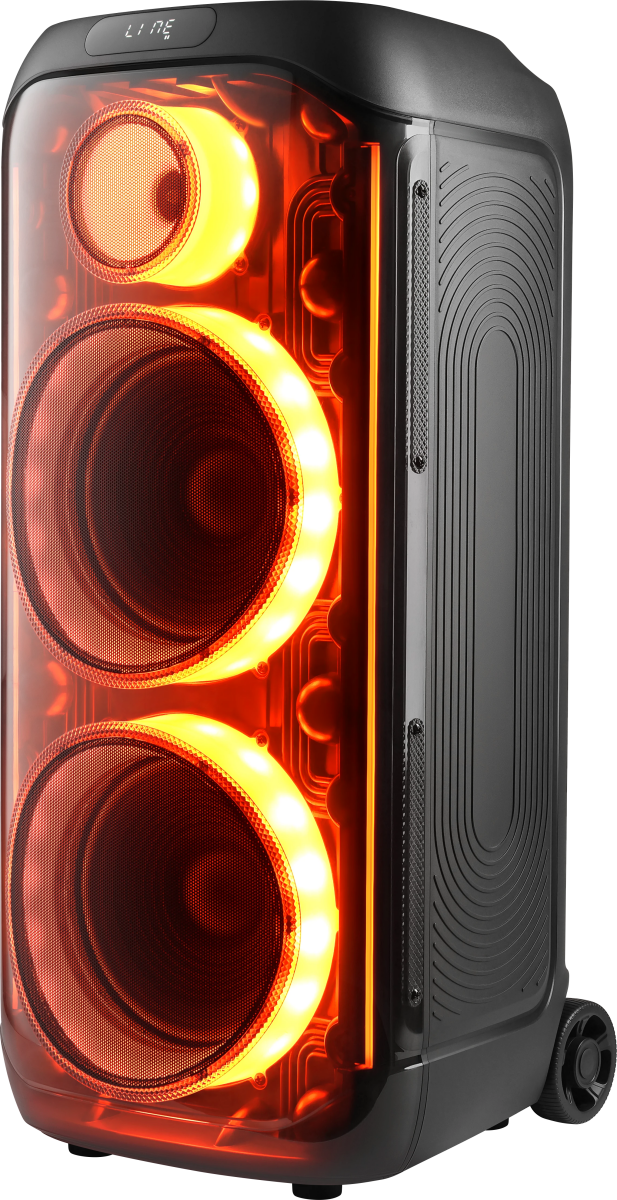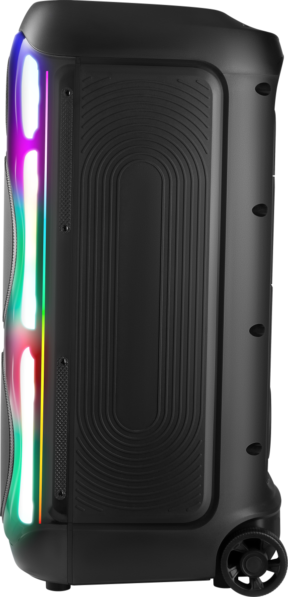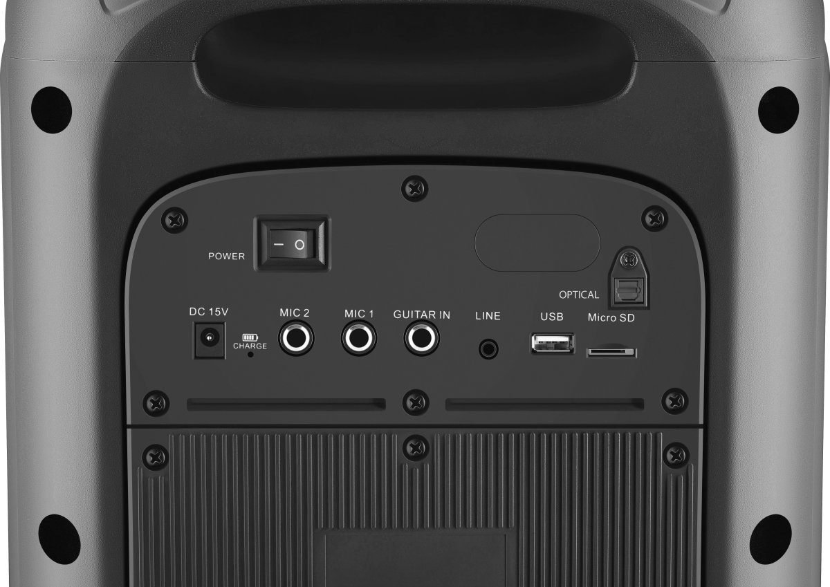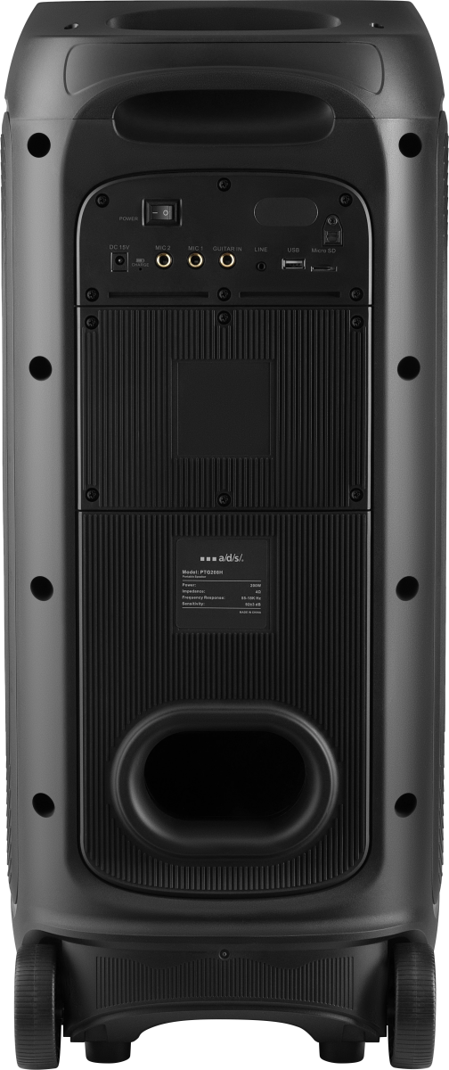 вход для гитары; выемка для смартфона на верхней панели; ручка и колёса для транспортировки; беспроводной микрофон в комплекте |
