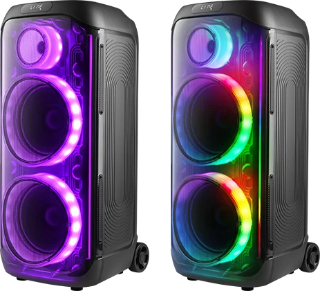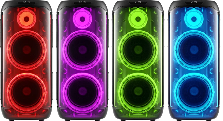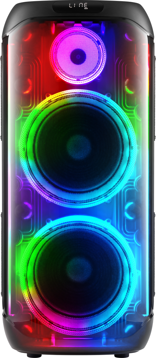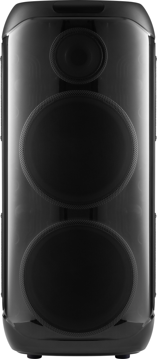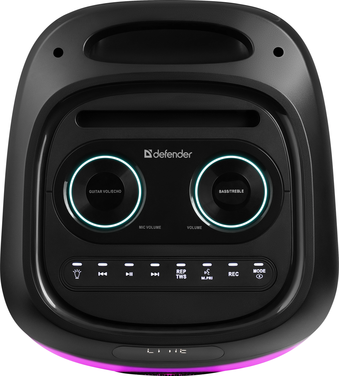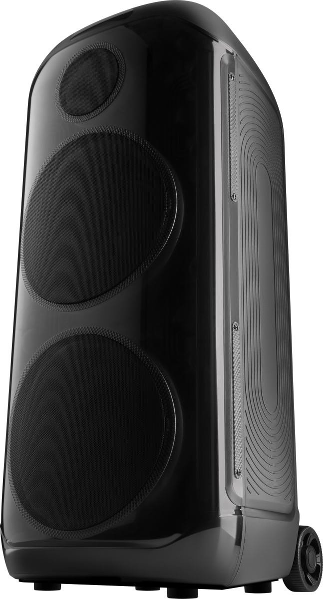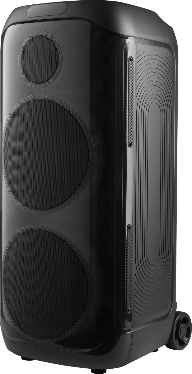 вход для гитары; выемка для смартфона на верхней панели; ручка и колёса для транспортировки; беспроводной микрофон в комплекте |