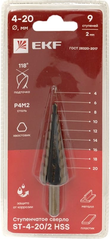 | Дополнительная информация | ступенчатое сверло, 9 ступеней: 4 - 20 мм с шагом 2 мм |