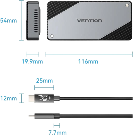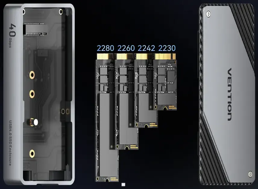 - интерфейс USB 4.0; - пропускная способность до 40 Гбит/с; - индикатор питания; - совместим со следующими размерами M.2: 2230/2242/2260/2280; - длина кабеля USB Type-C: 0.3 м |