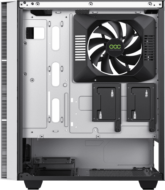 в передней панели предустановлена светодиодная лента; в комплекте держатель для видеокарты; с внутренней стороны боковой стенки предустановлен вентилятор COC Turbo для охлаждения сокета |