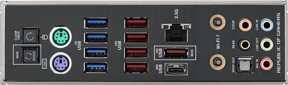 | Разъемы на задней панели | 2 x PS/2, 4 x USB 3.2 Gen1, 5 x USB 3.2 Gen2, USB 3.2 Gen2x2 Type-C, RJ-45, S/PDIF (оптический) |