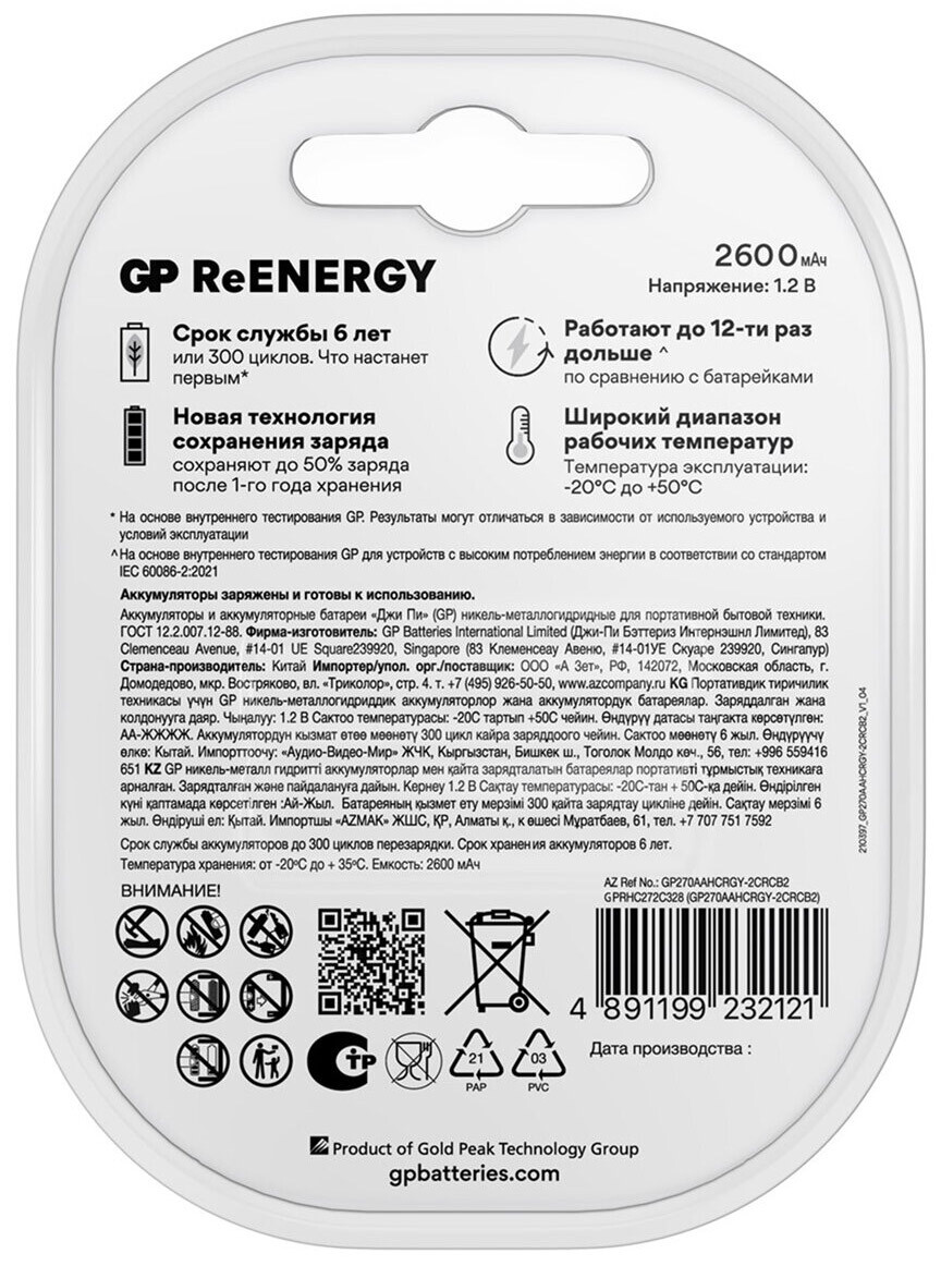Отзывы на GP ReEnergy (AA, 2600mAh, 2 шт.)