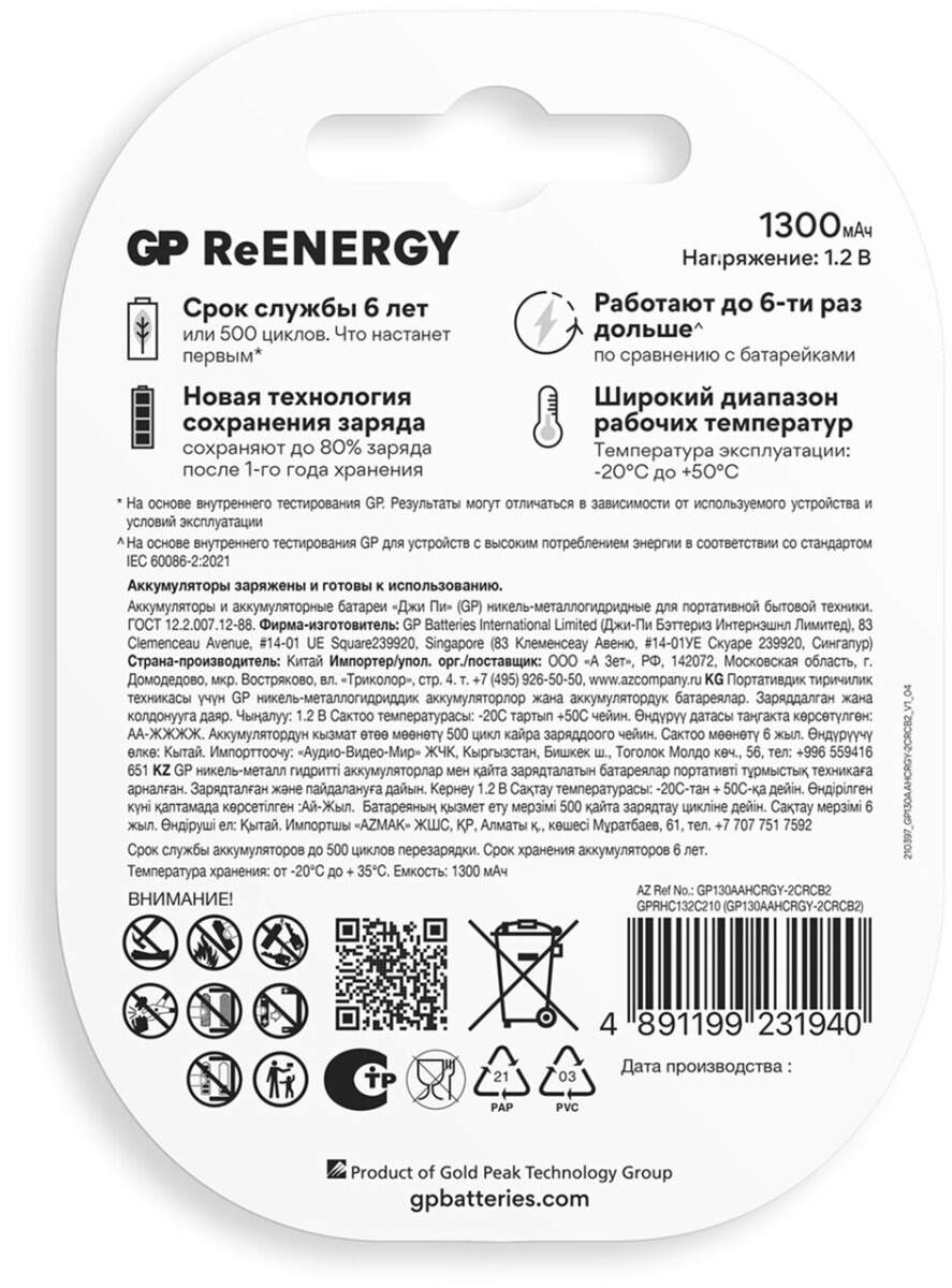 Отзывы на GP ReEnergy (AA, 1300mAh, 2 шт.) (130AAHCRGY-2CRCB2)