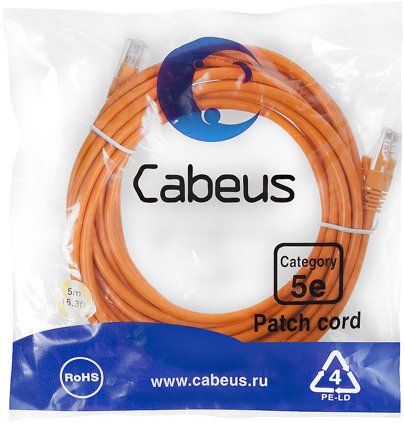 Отзывы на Cabeus PC-UTP-RJ45-Cat.5e-5m-OR-LSZH, 5м