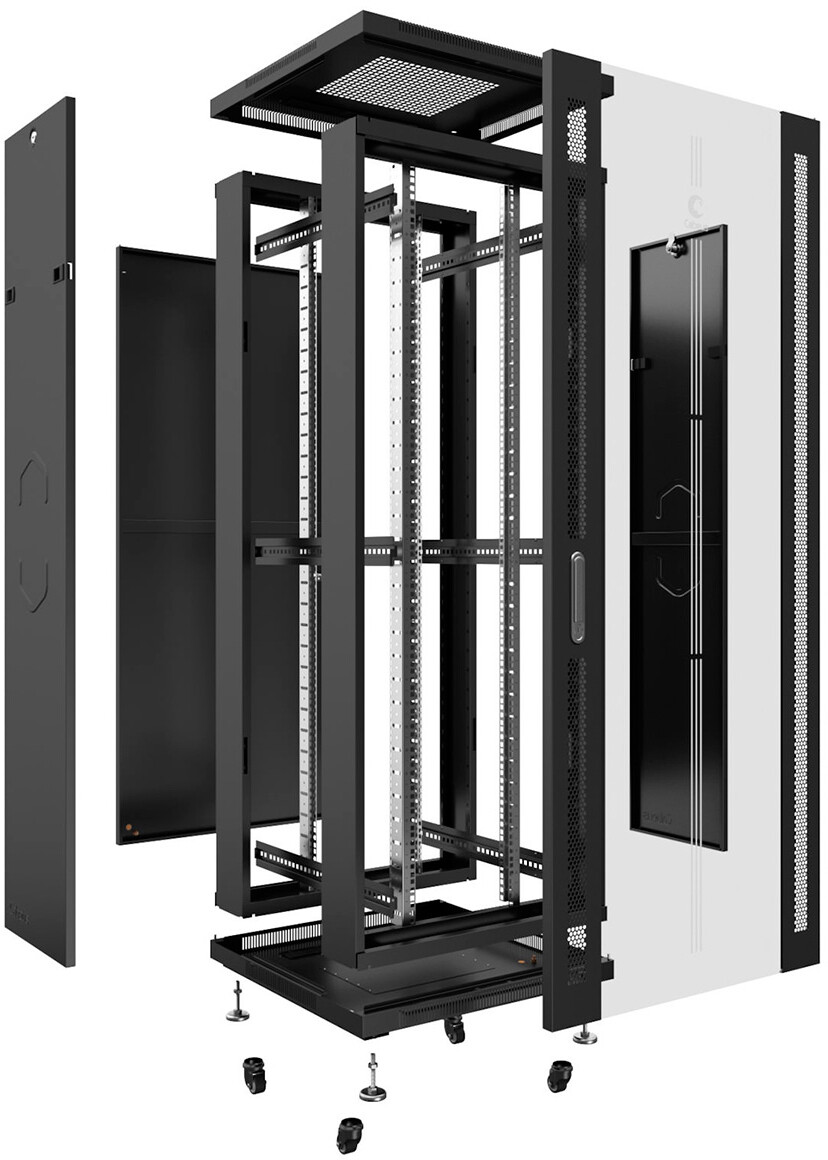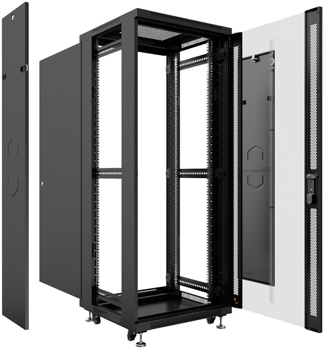 | Комплектация | передняя дверь с замками, задняя дверь с замками, 2 боковые съемные панели, 2 пары 19" монтажных профилей, регулируемые и роликовые опоры, крепежный комплект 30шт. |